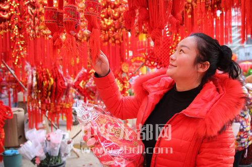 ????2月4日,在項城市水寨辦事處的一家商鋪前,市民正在挑選吊飾。新年臨近,當地百姓紛紛到市場上選購鮮切花、紅燈籠、中國結等節日飾品。 張永久 攝