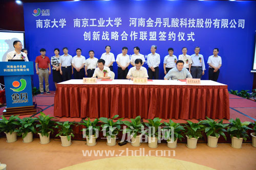 ????本報訊(記者 李莉) 7月9日上午,南京大學、南京工業大學、河南金丹乳酸科技股份有限公司創新戰略合作聯盟簽約儀式在鄭州舉行。副省長張維寧,中國工程院院士張全興,南京大學副校長談哲敏,南京工業大學副校長喬旭,省科技廳廳長張震宇,市委書記、市人大常委會主任徐光,省環保廳副廳長師偉,市委常委、常務副市長劉保倉,市委常委、組織部長靳磊,副市長王田業,及鄲城縣主要領導、河南金丹乳酸公司主要負責人出席簽約儀式。