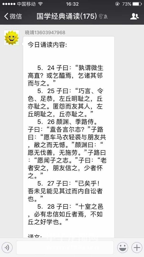 ????建立該微信群的是團(tuán)市委工作人員劉曉靖。劉曉靖告訴周口晚報(bào)記者,建立該微信群的目的是想讓大家多讀讀國學(xué)經(jīng)典,增加大家的文學(xué)涵養(yǎng),讓大家養(yǎng)成讀書的習(xí)慣。“剛開始只有十幾個(gè)人,大家有些不好意思,有的人覺得自己讀得不好張不開口,我就做一些示范,引領(lǐng)大家誦讀。不久,加入微信群的人多了,通過幾個(gè)人帶動(dòng),大家誦讀的就多了。”劉曉靖說,讀的方式就是大家通過微信的語音功能,讀一些《論語》中的經(jīng)典句子。過了一段時(shí)間,大家對(duì)這種方式越來越認(rèn)可,加入該微信群的人也越來越多,人數(shù)從剛開始的十幾個(gè)人增加到近200人。現(xiàn)在,該微信群里不但有電臺(tái)、電視臺(tái)的專業(yè)主持人,而且有一些學(xué)者。以前拿不準(zhǔn)的字,現(xiàn)在都會(huì)有人講解,大家也有了學(xué)習(xí)對(duì)象。這個(gè)微信群從成立到現(xiàn)在,《弟子規(guī)》、《大學(xué)》、《中庸》、《論語》已讀一遍,四書里面只剩下《孟子》還沒有讀。