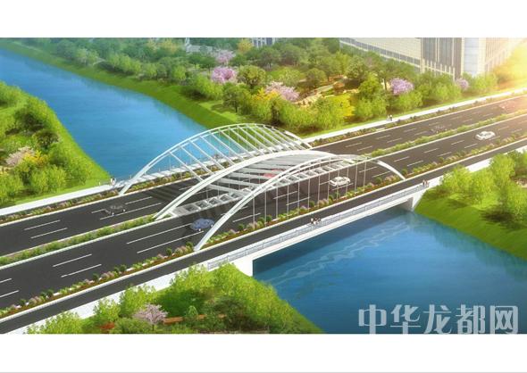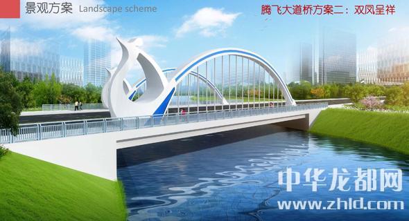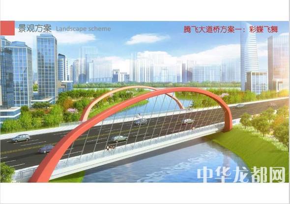 騰飛大道橋的設(shè)計(jì)方案有兩套,分別為“彩蝶飛舞”和“雙鳳呈祥”。“彩蝶飛舞”為下承式鋼管拱橋,寬36米。記者從效果圖中看到,橋兩側(cè)的拱圈,極具色彩感,給人一種賞心悅目的感覺。“雙鳳呈祥”為裝飾鋼管拱橋,寬36米。該橋采用“雙鳳”造型,象征天下太平,富含吉祥之意。