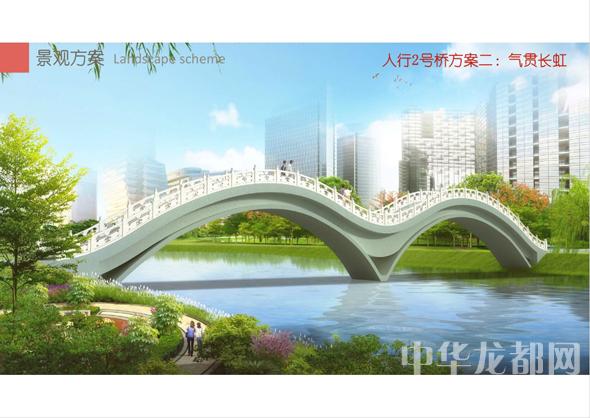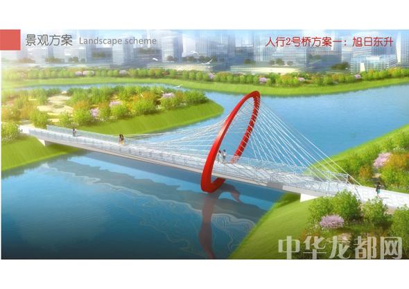 人行2號橋的設(shè)計(jì)方案有兩套,分別為“旭日東升”和“氣貫長虹”?!靶袢諙|升”為圓形塔懸索橋。記者從效果圖中看到,該橋的橋塔為圓形,猶如一輪東升的太陽,象征著城鄉(xiāng)一體化示范區(qū)蓬勃發(fā)展的未來。“氣貫長虹”為中承式系桿拱橋。該方案結(jié)合中國玉帶橋的古典元素、抽象古典幾何美學(xué),采用現(xiàn)代的設(shè)計(jì)手法,創(chuàng)作出現(xiàn)代感和中國傳統(tǒng)橋梁元素雜糅的橋梁設(shè)計(jì)。