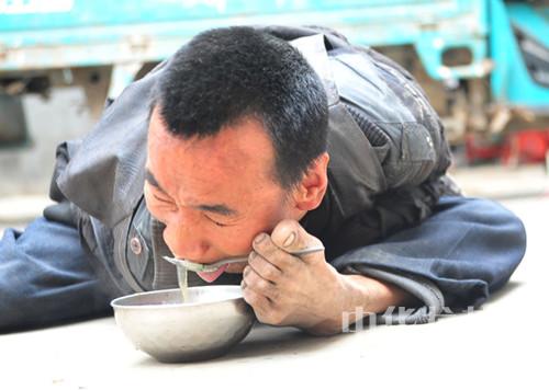 媽媽乘上一碗放在地上,紅印坐在墊子上,用腳夾著勺子,彎下腰來吃得很香。看到紅印吃飯那么費力,在場人心里酸酸的,為紅印自強不息所打動著。可是當初娘倆可沒少流眼淚,李新蘭發現兒子兩只腳是靈活完好的,就開始訓練他用腳吃飯、洗臉。養大一個正常的孩子尚且不易,何況是張紅印這樣的孩子?李新蘭一遍遍地教,年幼的張紅印一遍遍地學。難為到受不了時,娘倆就抱在一起哭。