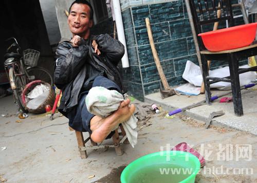 從十歲起,紅印就幫著媽媽燒鍋做飯,用腳學著點火,朝鍋底里續柴火,慢慢長大后,自己學會吃飯、洗衣、看家、簡單種菜,有時候還能修理個鄰居給的小玩具和小家電。他雖然不會說話,但能聽懂家里人的話意。紅印的爸爸今年68歲,提起紅印也愁也喜,“家里人都忙,幾個孩子相繼成家,我還有幾畝地要種,平時顧不上他,他自己也學著做些事情,真難為他啦!”