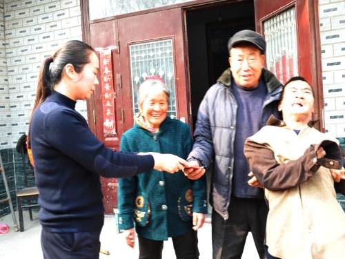 中華龍都網訊(周口報業全媒體記者 李瑞才 通訊員 胡洪濤 文圖)3月24日,鹿邑縣志愿者田小曼、羅曉光、韋坤三人一行到該縣鳴鹿辦事麻窩村慰問殘疾人張紅印和他的“愛心媽媽”,送去慰問金1000元和生活用品。