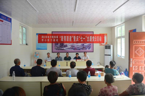 中華龍都網訊(周口報業全媒體記者 馬治衛 通訊員 蘇童)為喜慶中國共產黨建黨97周年,夯實貧困村基層組織基礎,促進脫貧攻堅工作深入開展,按照中共周口市委組織部和周口市直工委要求,6月26日上午,周口市地稅局組織相關科室負責人走進幫扶村太康縣王集鄉李小村行政村開展“黨建聯幫聯建暨慶七一主題黨日”活動。這是該局在幫扶村“兩委”成功換屆之后第一次舉辦主題黨日活動,市、縣、鄉各級領導及駐村工作隊和幫扶村30余名黨員代表參加了此次活動。