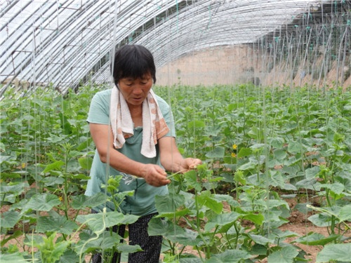 近年來,沈丘縣周營鎮大力發展藥材種植和特色瓜果蔬菜種植,既解決了貧困戶的就業問題,又促進了當地農業生產。圖為7月24日,貧困群眾孫素英在蔬菜種植基地管理吊籐晚秋小黃瓜。 記者 韋偉 通訊員 謝辛凌 攝