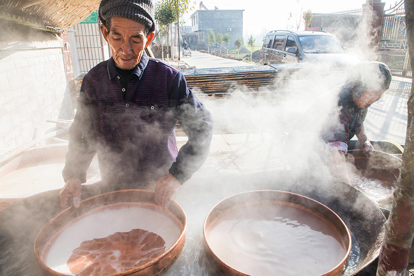 一對(duì)老夫妻正在做粉皮