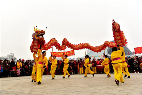 展演現(xiàn)場,人頭攢動,鑼鼓喧囂,16名身穿金黃、亮藍衣服的舞龍隊員率先登場,金燦燦的巨龍時而甩尾前行,時而昂首盤踞,浩浩蕩蕩;8只舞獅歡騰雀躍、活靈活現(xiàn);精美的裝飾的旱船穿行其中,老生、老旦扮相的隊員邊走邊唱;整齊劃一的腰鼓隊以及隊形優(yōu)美的擔經(jīng)挑把現(xiàn)場氣氛推向高潮……持續(xù)近2小時的展演活動中,精彩的民俗表演令人目不暇接,為這座城市增添了濃濃的年味。