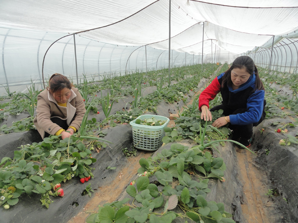 2月27日,商水縣鄧城鎮返鄉創業標兵、鎮人大代表馮杰(右)對草莓進行疏葉管理。馮杰在鎮人大、工商聯幫助下創辦了生態葡萄園,并種植了溫室草莓,安排了50名貧困戶就業。
