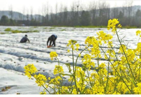 3月11日,農(nóng)民正在蔬菜基地勞作。隨著天氣回暖,各地農(nóng)民搶抓農(nóng)時,在田間地頭伴著花香進行春耕生產(chǎn)。李建新 攝
