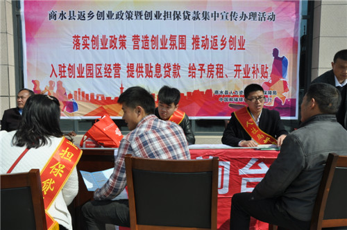 3月18日上午,商水縣人社局和縣郵儲銀行聯合在省級農民工返鄉創業示范園區周口汽配城開展創業補貼、創業擔保貸款優惠政策宣傳。