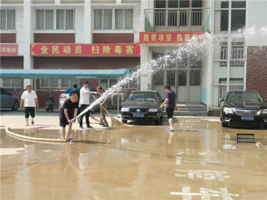 雖然天氣炎熱,大家汗流浹背,卻熱情高漲,積極性很高,大家紛紛拿起掃帚、抹布,提上水桶,充分發揚不怕臟、不怕累的精神,對院內道路、車棚、宣傳欄、綠化帶等處進行沖洗、清掃,同時對各樓層門窗玻璃、消防栓、廁所等進行集中清理……經過兩個多小時的辛勤勞動,各辦公室窗明幾凈,廁所衛生干凈整潔,車棚車輛擺放整齊,院內環境煥然一新。