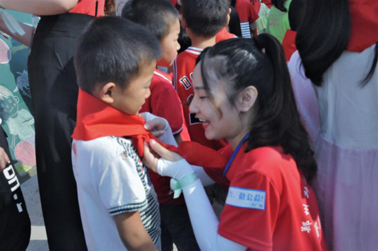 開班儀式上,鄭州升達經貿管理學院的支教老師為同學們佩戴了紅領巾,伴隨著國歌進行了升國旗教育,支教老師進行集體宣誓。支教老師代表作表態發言時說:“很高興能夠來鹿邑周樓小學支教,作為一名當代青年大學生,我們能夠擔當重任,吃苦耐勞,全身心地完成兩周的支教活動,與孩子們快樂相處。”