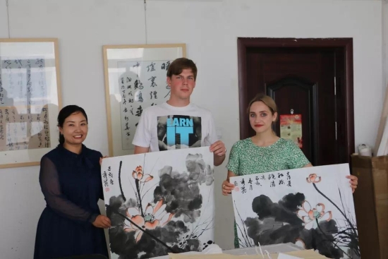 在縣文聯主席王亞飛、縣美協主席王廣豐、美協副主席高囡等陪同下,兩位俄羅斯青年畫家來到縣文聯畫室,與鹿邑著名花鳥畫家劉龍飛、青年畫家張秀麗進行藝術交流,青年畫家張秀麗現場作畫贈予阿列克謝與葉卡捷琳娜。