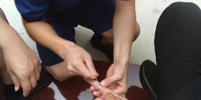 經過查看,由于尺寸不合適,該男子左手中指已經被戒指卡的出現充血,手指腫脹嚴重。考慮到用剪切器等器械剪戒指可能會傷到手指,指戰員利用纏線解線的方法,用細線穿過戒指在手指上纏繞,然后慢慢拉線,利用細線的滑潤效果幫助取下戒指,很快戒指被成功取下。