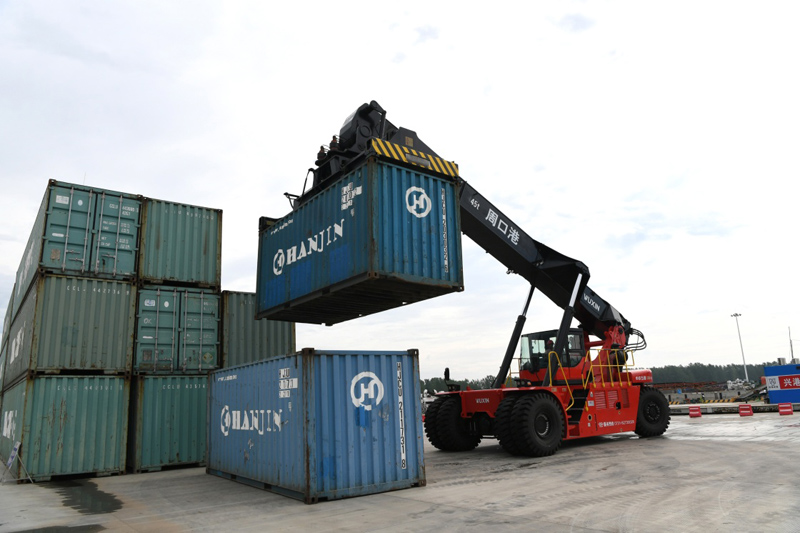 7月31日,工人在周口中心港碼頭搬運(yùn)集裝箱。