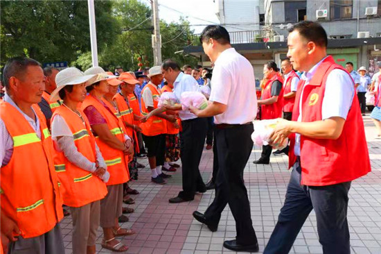8月8日,扶溝縣政協主席張建中帶領縣政協委員和政協機關志愿者到縣城桐丘路視察文明城市創建工作,并看望慰問環衛工人和城管工作人員。縣政協常委田孟偉代表達理家居有限公司捐贈價值2萬余元防暑降溫用品,助力扶溝縣省級文明城市創建工作。