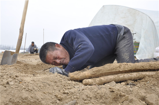 11月26日,沈丘縣白集鎮(zhèn)40多歲的耿金中與另外兩個(gè)同伴一起來到周口城鄉(xiāng)一體化示范區(qū)許灣鄉(xiāng)肖王莊,未來的一段時(shí)間,他們吃住都將在這里進(jìn)行,直到將這一區(qū)域的山藥挖完。耿金中說,他挖山藥已經(jīng)有20多年了,20多年前,沈丘縣大規(guī)模種植山藥,每到收獲時(shí),會(huì)有很多山東挖山藥工人來這里挖山藥。他看到這個(gè)行當(dāng)能賺錢,就開始學(xué)挖山藥技術(shù)。此后的多年,他先后到山西、湖北、安徽等地挖山藥。