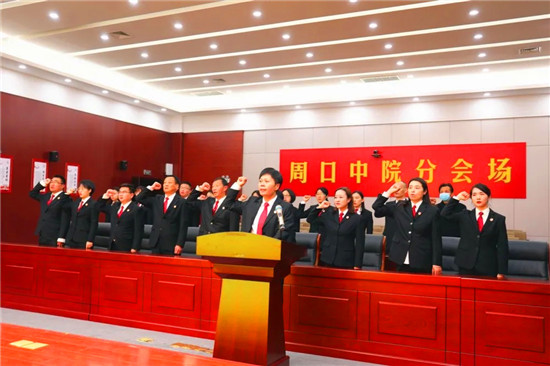 在第七個國家憲法日來臨之際,為深入學習宣傳習近平法治思想,大力弘揚憲法精神,2020年12月3日,周口市中級人民法院組織干警向憲法莊嚴宣誓。