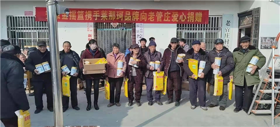 “這是在安徽金搖藍公司工作的老官莊村人王北領、王建立攜手萊那珂奶粉企業慰問鄉親們吶!”武金英老人一臉幸福。據悉,這次慰問的對象是老官莊貧困戶、60歲以上老人及困難群眾,慰問捐贈的禮品為奶粉240桶,價值十萬余元。同時,老官莊新當選地村黨支部書記王杰華也出資5000元,為村里的60歲以上老人及困難群眾購買大米120袋,用行動為老官莊老人送去節日的祝福。