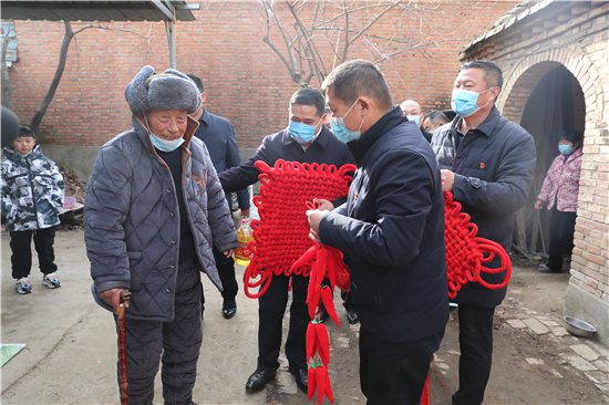 在鄭家集鄉韓樓村,縣農商銀行鄭家集支行行長武繼龍帶領員工來到92歲韓老漢的家中,看到韓老漢由于身體原因只能靠拐棍佝僂著背站著,武繼龍緊忙彎腰俯下身說:“大爺,快過年了,我們來看看您,提前給您拜個早年!”“真的是太感謝恁了,這么冷的天,還讓你們來送到家里面。”韓老漢激動地說。