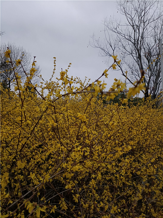 黃色的迎春花似云霞滿天,白色的玉蘭花婀娜多姿,紅色玉蘭含苞待放,即將飄零的臘梅老也留戀枝頭,舍不得離去,鮮艷的百花醉得垂柳在水面上扭起纖細的枝條。