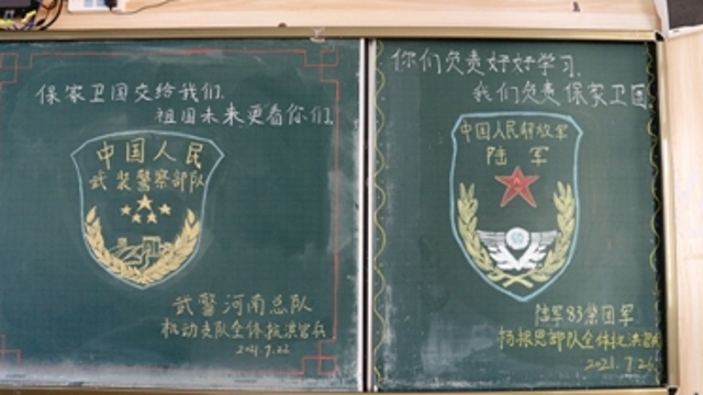 ??“保家衛國交給我們,祖國未來更看你們!”“你們負責好好學習,我們負責保家衛國!”在鄭州市第七十三中學的一間教室里,參與救災援助的抗洪官兵們給同學們留下了兩幅黑板報。在師生們眼里,這就是名副其實的“最美黑板報”。