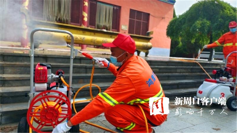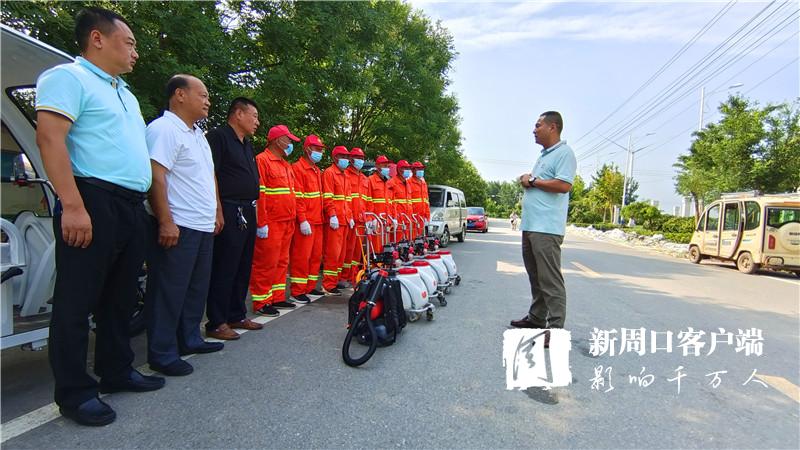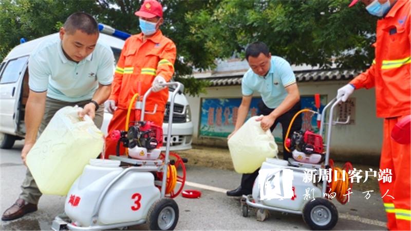 “老關,你們三四個人去女媧景區消殺。老王,老溫你們兩個人去村莊消殺,尤其是旮旯處、垃圾堆、屋后等隱蔽重點區域一定消殺徹底,不留空白。在村莊內進行消殺時,一定要和群眾交代好防疫消毒時的注意事項。”7月30日9時許,來自廣州市鴻鷹害蟲防治服務有限公司周口分公司的10多名愛心人士載著4臺機動手推式滯留噴霧機、1臺電動背負式超低容量噴霧機、1臺大型車載式超低容量噴霧機和230公斤消毒劑,來到西華聶堆鎮思都崗村后,該公司負責人許金山就向工作人員一一分配消殺任務。