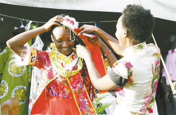 11月10日,學(xué)生在盧旺達(dá)卡永扎試穿中國(guó)服飾。