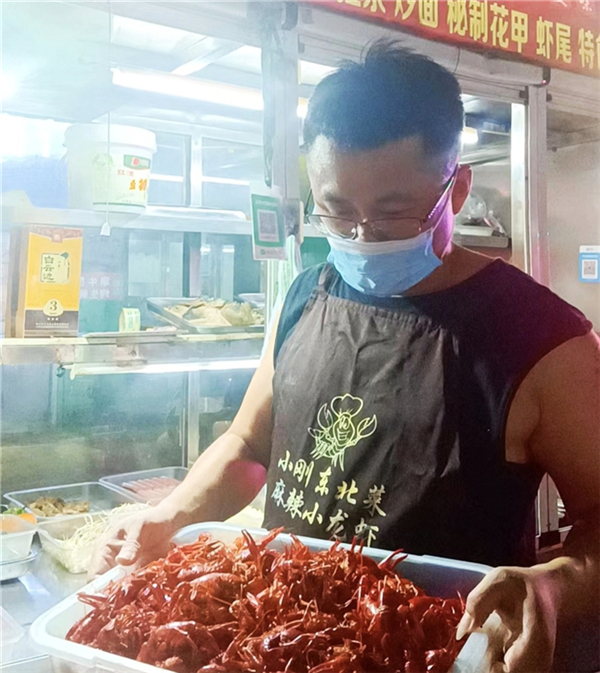 “東北小剛”麻辣小龍蝦的攤主“小剛”名叫王紅剛,來自黑龍江省哈爾濱市,今年36歲,是地道的東北人。6年前,他和項城媳婦趙薇薇在北京相戀并結婚,然后就來到了項城經營這個小夜攤,生意還不錯。