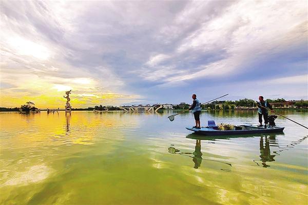 8月13日,當第一縷晨光穿過云層,水云間的淮陽萬畝龍湖景色怡人。此時,一艘打撈船也開始“搜尋”湖面漂浮的垃圾。正在晨練的一位市民說:“正是環衛工人日復一日、年復一年默默無聞的工作,才換來我們身邊美好的生活環境,他們才是最美的風景。”記者 杜欣 攝