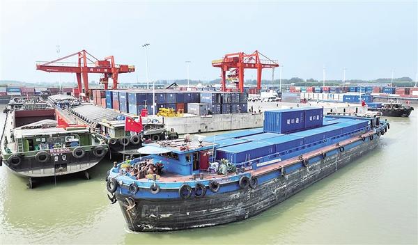 清晨的沙潁河畔,周口港范營作業區一派繁忙景象。巍然聳立的橋吊如鋼鐵巨臂,精準地將五顏六色的集裝箱吊裝至貨輪;