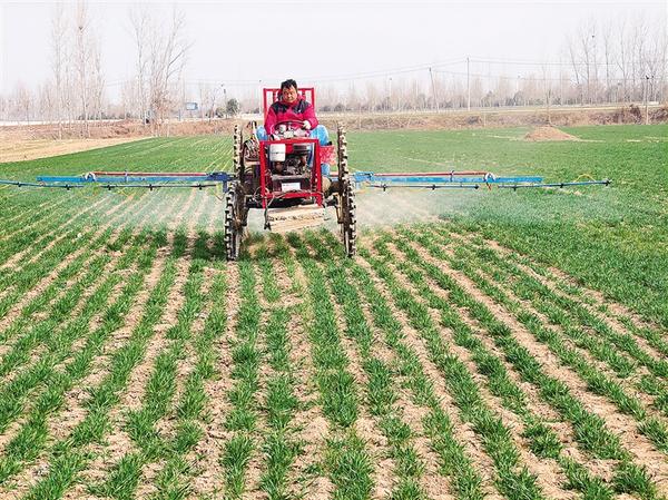 眼下正是春季田間管理的關鍵期。2月25日,在位于鄲城縣的周口市農科院科研基地麥田里,工作人員正駕駛農業機械噴灑除草劑。