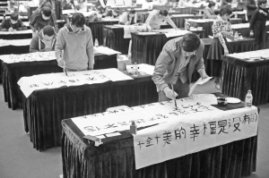 2015“金臺杯”世界大學生書法大賽復賽在京舉行 4月12日,參賽選手在現場書寫作品。當日,由中國藝術教育促進會主辦的2015“金臺杯”世界大學生書法大賽復賽在北京舉行。據了解,本次大賽初賽已于2014年11月完成,復賽按中國和外國兩大組分別進行評選,最終在百余位參賽的選手中選出一等獎、二等獎、三等獎和優秀獎。 新華社發