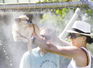 熱浪襲擊溫哥華 6月27日, 在加拿大溫哥華, 一名女子利用街頭的噴水設施為寵物狗降溫。據(jù)加拿大環(huán)境部門檢測,不列顛哥倫比亞省沿岸地區(qū)當日最高氣溫達攝氏三十度,內陸地區(qū)升至四十度。溫哥華市政府已發(fā)出高溫預警,呼吁民眾外出時注意身體狀況,謹防中暑。新華社發(fā)