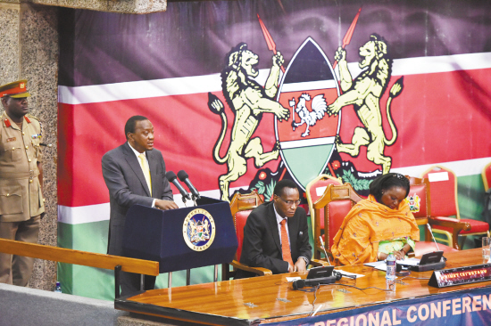 肯尼亞舉辦地區會議呼吁國際社會合作反恐 6月27日,在肯尼亞內羅畢,肯尼亞總統肯雅塔(左)在地區會議上致閉幕辭。肯尼亞政府于25日至27日在首都內羅畢舉辦地區會議,探討如何應對暴力極端主義和恐怖活動,并呼吁國際社會合作反恐。(本欄文圖均據新華社發)