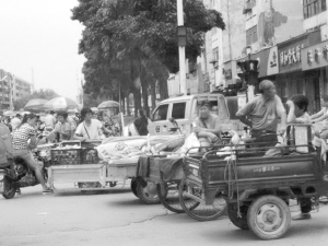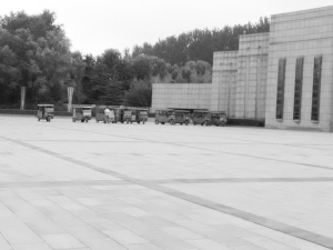 圖① 周口師范學院大門前又見排成一行的“紅頂三輪車”在從事非法營運,沒人進行管理。