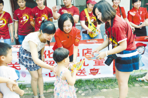 6月19日,端午節臨近之際,“美膚寶”攜手沈丘縣李玲化妝品店,來到沈丘縣豐產河小學開展“美膚寶陽光計劃”公益活動,共同為200多名留守兒童捐贈學習用品。圖為工作人員為留守兒童發放學習用品。(記者 韋偉 通訊員 王祥宇 柳珂)
