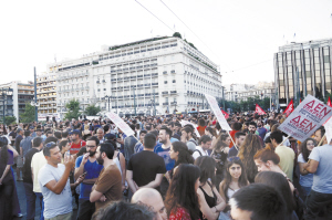 7月13日,民眾在希臘雅典參加集會,抗議財政緊縮措施。新華社發