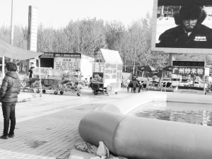 4月8日18時(shí)許,記者在現(xiàn)場看到,廣場的中央噴泉東側(cè)擺了許多攤點(diǎn),有的攤點(diǎn)甚至把桌椅擺到了人行道上(如圖)。在廣場東側(cè)的出入口處,一些賣飯的商販已經(jīng)將桌椅擺放整齊,不寬的道路被占去近一半。